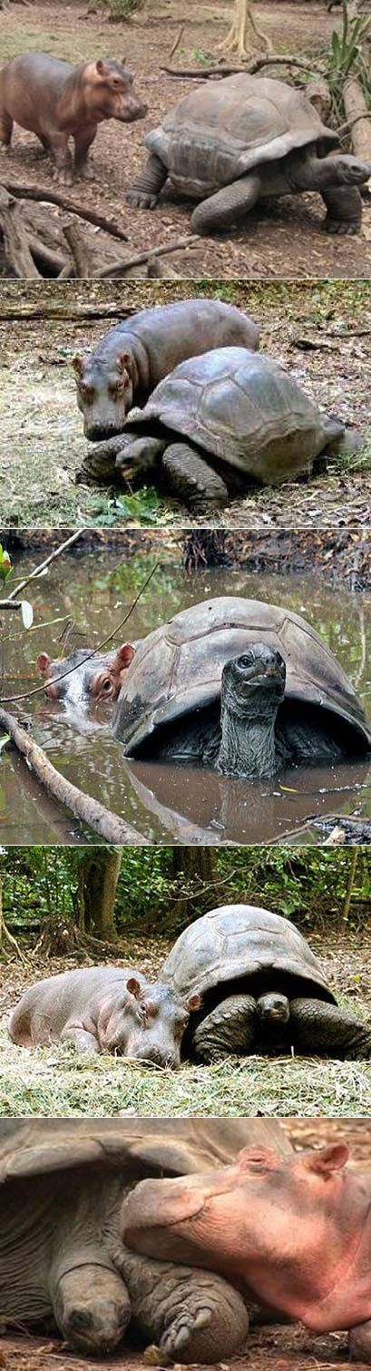 A baby hippo was swept away by a tsunami and rescued by a wild life reservation. A 130 year old tortoise immediately befriended him.