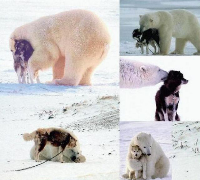 A photographer witnessed a wild polar bear coming upon tethered sled dogs in the wilderness of Canada’s Hudson Bay. Instead of devouring the dogs, they played and cuddled. The polar bear returned every night that week.