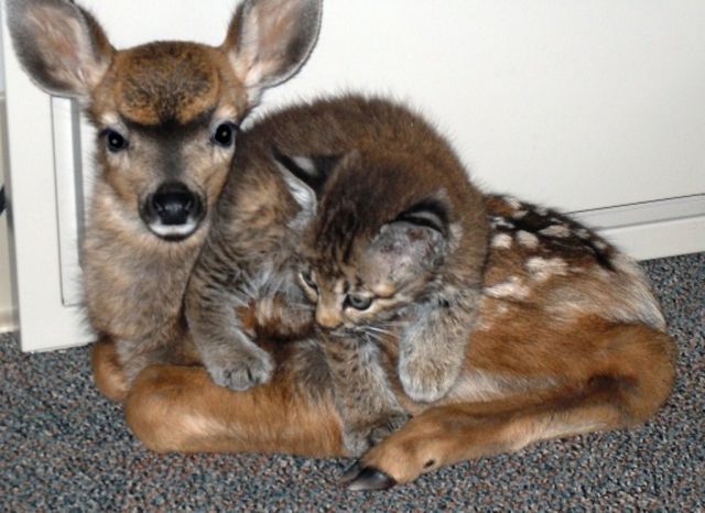 After a devastating forest fire, fire rescue ran out of crates for the animals saved from the blazes. This fawn and baby bobcat were placed together in the office. Hours later, firemen noticed they’d taken a liking to one another and cuddled for the duration they were kept together.