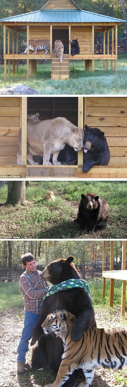 A lion, tiger, and bear raised together in the same enclosure at Noah’s Ark Sanctuary in GA play ball, cuddle, and chase each other.