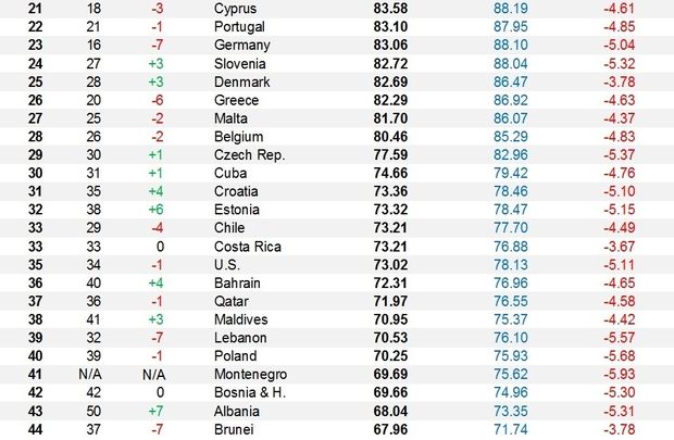 Para que un país sea incluido en esta lista, se puntúa a 169 países con más de 300.000 habitantes cada uno y con una suficiente información sobre las variables que forman parte del informe en cuestión.