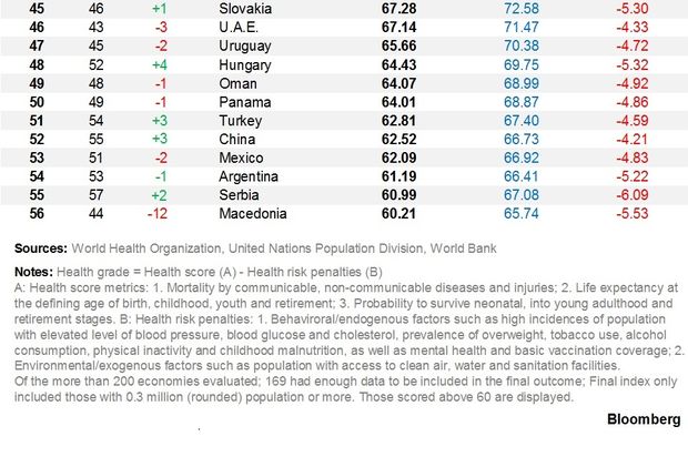 Bloomberg evaluó estas variables de salud y los riesgos que van desde los de naturaleza del comportamiento a las características ambientales. El índice final solo incluyó naciones con al menos 0,3 millones de habitantes y datos suficientes en donde solo 169 países de la OMS cumplieron con los criterios para ser incluidos.