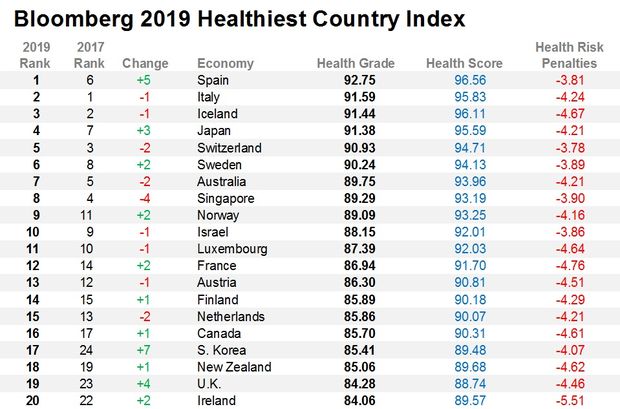 En el top ten se encontraban 4 países europeos como Islandia (tercer lugar), Suiza (quinto), Suecia (sexto) y Noruega (noveno). Japón fue la nación asiática más saludable, saltó tres lugares de la encuesta de 2017 a la cuarta y reemplazó a Singapur, que cayó a la octava. Australia e Israel completaron el top 10 en el séptimo y décimo lugar.