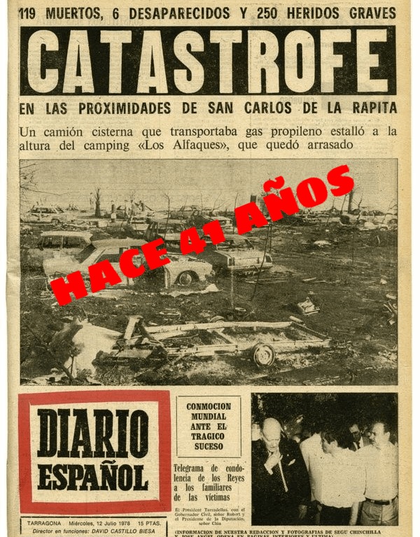 Era las dos y media de la tarde, cuando el terror de pronto se apoderó del camping «Los Alfaques» Els Alfacs, perteneciente al término municipal de Alcanar muy cerca del núcleo urbano de Sant Carles de la Ràpita, en donde muchos se encontraban disfrutando de la comida cuando un camión cisterna cargado de propileno licuado, explotó justo cuando pasaba por delante del camping. Incidente en el que perdieron la vida màs de 200 personas entre niños jóvenes y adultos, con más de un centenar de heridos con graves secuelas y otros tantos que fueron igualmente hospitalizados por heridas más leves.