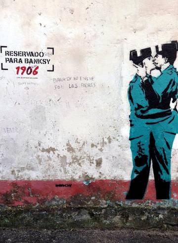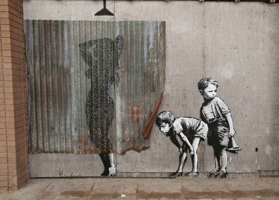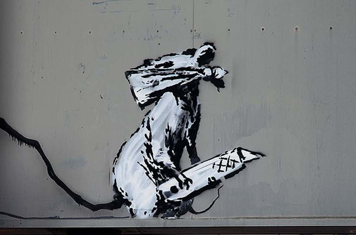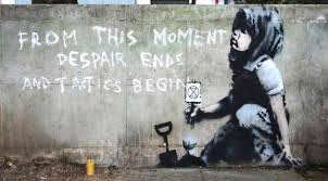 Los graffitis de Bansky suelen aparecer de pronto, cuando menos te lo esperas en donde menos te lo esperas, de la noche a la mañana. En ellos desnuda a la «sociedad» cual cebolla, capa a capa: su hipocresía, la corrupcion en la clase política, la indiferencia, la falta de humanidad, haciendoles frente en una especie de guerra declarada al capitalismo y a todos sus demonios logrando inmortalizar a Bansky ante propios y extraños en la historia del arte, en donde sin querer queriendo, se ha catapultado como una especie de ícono para muchos desde que vio la luz en la década de los 90 en que forma parte del colectivo de graffiti llamado DryBreadZ Crew en la ciudad de Bristol al sudoeste de Inglaterra, considerada la capital mundial del graffiti en la que nació, presumiblemente en el año de 1975, ciudad en la que desde muy tierna edad a finales de los 80 se funde en el boom de los aerosoles.