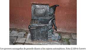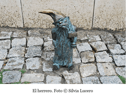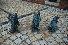 «Wroclaw o Breslavia es la ciudad Polaca de los gnomos. Existe una interesante propuesta de Arte público en toda la ciudad. Actualmente hay más de 200 esculturas de gnomos de bronce diseminadas por todo el casco urbano dela ciudad que recogen la tradición popular polaca de los “Krasnoludk”, especie de duendecillos que luchan contra la mala suerte. Desde el 2001, el Ayuntamiento de la ciudad en cabeza del Alcalde(al que muchos llamaron loco) comenzó a rendir tributo a las leyendas y tradiciones relacionadas con los duendes. Estas 200 esculturas repartidas por diferentes rincones convierten el pasear por Wroclaw en un divertido juego. Existe un mapa de gnomos para encontrarlos, cada uno representa algún oficio del hombre o alguna escultura simbólica. Hay uno hecho por Botero y otro que representa a un artista pintando que es Van Gogh; la gente los vive buscando a cada momento hasta completar los 200. Es un interesante proyecto en el que cada año invitan a un artista importante para que haga una nueva escultura”.