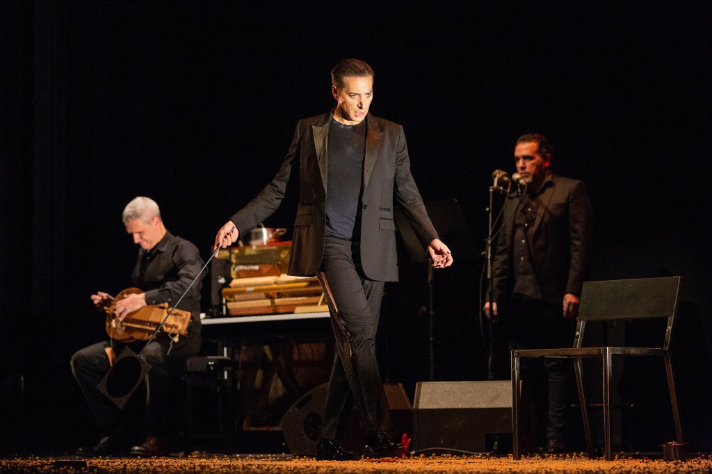 Israel recorre la escena bailando, creando inquietudes o relajadamente, vestido de negro, a los sones de toques y cantes. Pelo engominado corto, pegado al cráneo, muy estilo años 20 del XX. Con una mímica gestual que recuerda a alguien. ¿A quién? ¿Está otra vez impersonando a alguien?