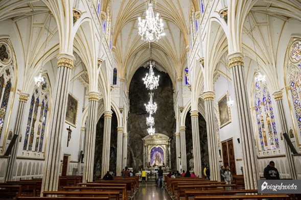 El interior del santuario, las tres naves adornadas sus bóvedas de crucería. Con mosaicos en fibra de vidrio y en el día, le da la luz que se filtra por los vitrales hechos por el Alemán Walter Wolf. El fondo o cúpula de las tres naves es el muro de piedra natural del cañón y en la nave central la adorna la imagen de la Virgen del Rosario pintada por un autor desconocido en una piedra laja. El pedestal del templo propiamente dicho, además de los dos arcos de medio punto del puente, es una cripta a imitación del estilo románico, de tres naves cubiertas con bóvedas de cañón de estructura en piedra sillar y que está dedicada al Sagrado Corazón de Jesús.