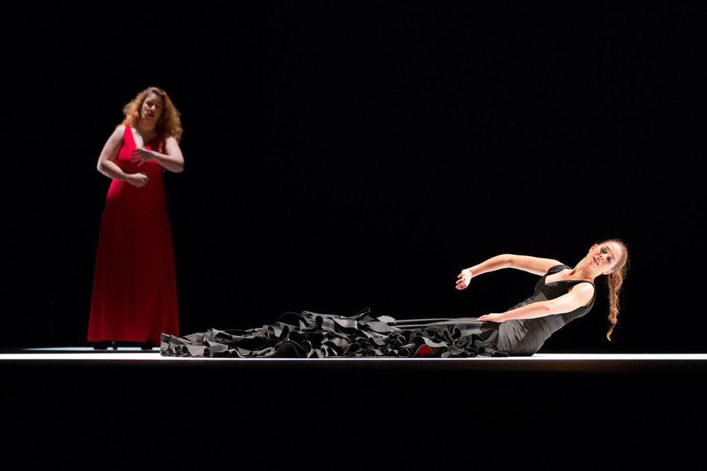 Teresa. Cierto que todo, además de tu baile y el de tus bailarines, las músicas, la iluminación, el sonido, son elementos de expresión de lo que sucede en escena. Pero en este caso, encuentro que el vestuario es determinante. En Distopía, ¿que nos estás contando con el rojo, el negro, la bata de cola, el blanco y ese abrigo que me fascina con el que empiezas y acabas?