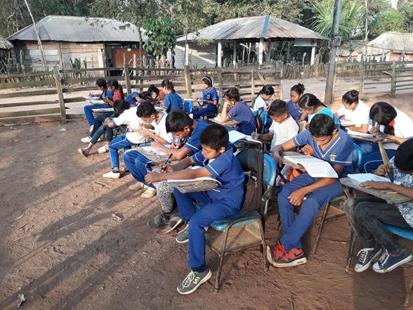 En esta institución los niños desde los 9 años hasta los 16 años aprenden a ser artistas y así, ser hombres de bien. Aquí vemos un salón de clase, en la escuela de San Isidro su local estudiantil está en ruinas y es más seguro estudiar al aire libre que en los tres recintos en ruinas, pero no importa es un escenario propio para aprenden y estar en contacto con la naturaleza. Les falta una infraestructura moderna pero ellos no les afanan ni hacen protestas o huelgas, con fe y deseos de superación salen adelante.