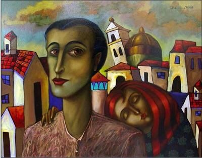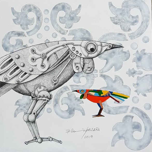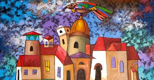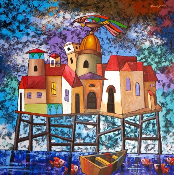 El arte de «Efraín Saldaña«, sus brillantes y tonos y figuras no son indiferentes a nuestra realidad aunque el creo un mundo muy vertical al real pero esas líneas se unen en nuestros recuerdos.
