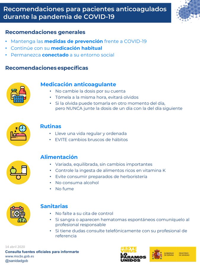 Un paciente anticoagulado necesita «regular y disminuir el nivel de coagulación de la sangre», para ello, debe medicarse y someterse a un tratamiento que le permita controlar este problema y mejorar su calidad de vida. La coagulación de la sangre permite taponar una herida para evitar desangrarse, sin embargo, en un paciente anticoagulado la coagulación se produce en situaciones en las que no resulta necesaria como consecuencia, las venas y arterias pueden obstruirse así mismo las razones por las que una persona puede convertirse en un paciente anticoagulado están relacionadas con haber sufrido previamente un accidente cardiovascular o un ictus no obstante también puede existir alguna patología que predisponga a padecer este problema. El paciente anticoagulado toma una medicación por razones muy diversas, generalmente son cardíacas, y las más importantes son alteraciones del ritmo del corazón que dan lugar a problemas de embolias o recambio de válvulas artificiales del corazón. En estos tiempos del covid-19 se recomienda: