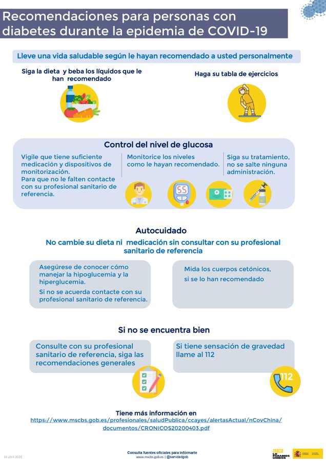 Asegúrate de tener la suficiente medicación y dispositivos de monitorización, No cambies tu dieta ni medicación sin consultarlo. Sigue la dieta que tienes y los ejercicios que te hayan recomendado asi mismo controla tu nivel de glucosa. Si tienes sensación de gravedad llama al 112 en toda España y si eres de otro país llama de inmediato a los teléfonos de Emergencia nacionales que debes tener a mano.