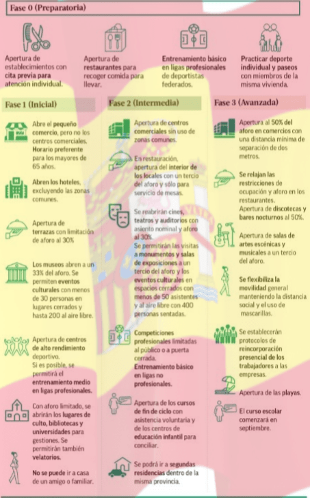 La Península Ibérica de España entra en las fases de desconfinamiento para una «nueva normalidad» tras el inicio de la pandemia del coronavirus ya ha comenzado y si todo va bien previsiblemente terminará a finales de junio. Normalidad que se presume será diferente después de la aparición de esta pandemia en nuestras vidas por lo que este programa de desescalada llamado «Plan para la Transición hacia una nueva normalidad’ no tendrá fechas concretas para la reapertura de comercios como sucede en otros países ya que esta será una desescalada gradual, asimétrica y coordinada protegiendo la salud de los españoles.