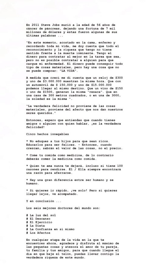 Así mismo trascendió que Alessandro Lequio el dia de ayer publico en una red social una bonita reflexión sobre la «verdadera riqueza» de la vida, se trataba de unas reflexiones que Steve Jobs, fallecido a los 56 a causa de un cáncer, escribió antes de morir en las que hablaba de las cosas «verdaderamente» importantes en la vida en donde decía que «La verdadera felicidad no viene de las cosas materiales», así mismo afirmaba que «Si quieres ir rápido ve sólo, pero si quieres llegar lejos, ve acompañado«. A continuación lo que publicó…