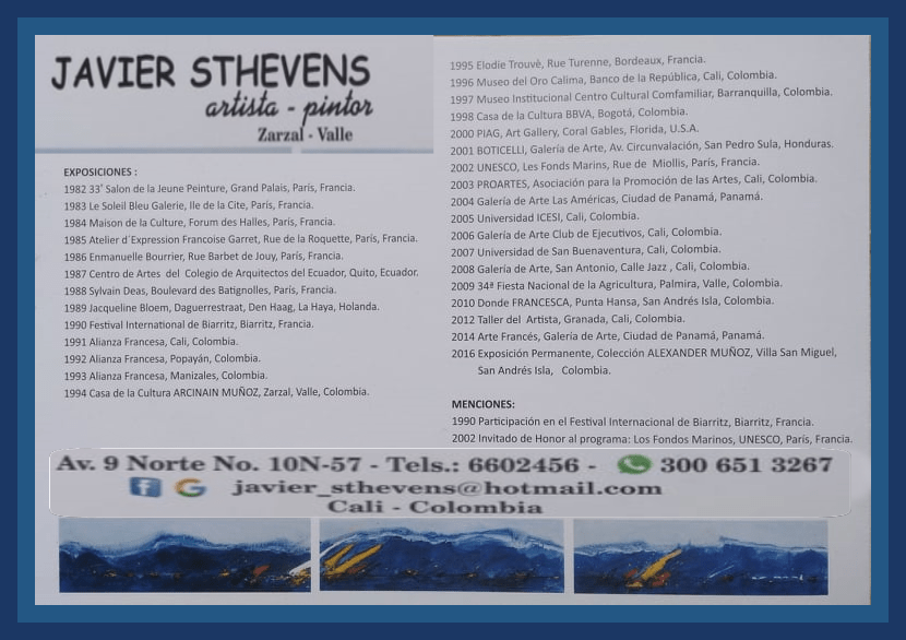 Javier Sthevens es un talentoso pintor colombiano. Nacido en Zarzal, un pueblo ubicado en el norte del departamento del Valle del Cauca, al sur-occidente colombiano cuya economía del lugar se basa por excelencia en el cultivo extensivo de la caña de azúcar, destacando el desarrollo de empresas en los sectores de alimentación y de la salud.