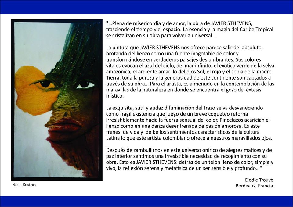 …. This is, broadly speaking, his story, the story of Javier Sthevens, a young Colombian who crossed oceans to conquer a dream, which he achieved and today is happy in his beautiful Colombia doing what he knows best: Art of which we are more and more, the followers that we admire, enjoy and delight in this, thanks to talents like Sthevens that today are and should be considered: heritage of humanity.
