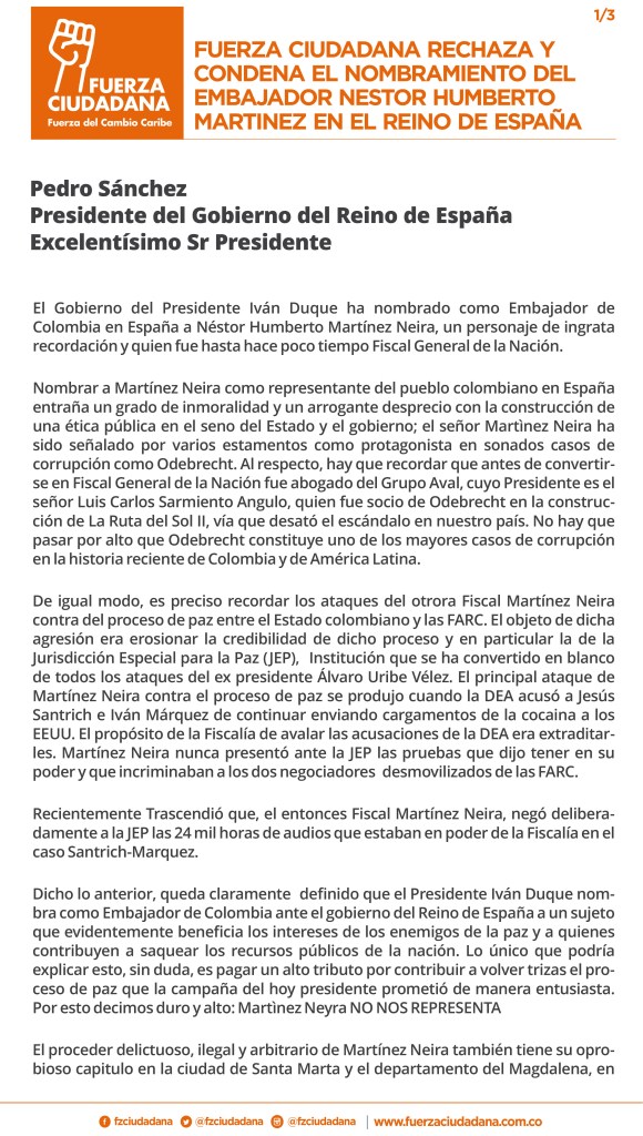 El movimiento Fuerza Ciudadana, fundado por el hoy gobernador del Magdalena Carlos Caicedo, instó al presidente del gobierno del Reino de España, Pedro Sánchez, a que considere la inconveniencia de aceptar como embajador de Colombia en ese país al exfiscal Néstor Humberto Martínez Neira, a quien se le asignan múltiples irregularidades que muestran una gestión repleta de “conductas delictivas”.