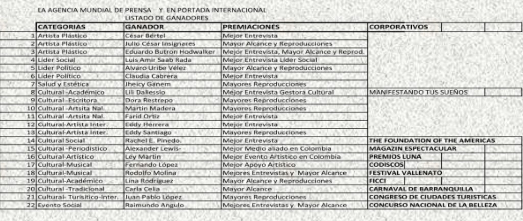 Director General, Best International Cartoonist of the Decade Oscar Rodriguez México – Interlaced Medium Best Collaborator Press Specialized in International Economics & Finance Miguel José Ramirez México – Director General, Best Photojournalist of the Decade Roberto Garaycoa Cuba – Ex-Director General, Economy and Finances Gerardo Marrugo Colombia – General Director of Couples Specialized Press and Collaborator Ma. Gloria Carreón Z. Mexico – General Director of The World Press Agency of Honduras José Eli – Former General Director of the Elderly Specialized Press Servio Lima Paladines Ecuador – The World Press Agency The Colombia Team – General Director of the World Press Agency of Catalonia Jordi Matamoros – Interlaced Media Collaborator Information and News Colombia Gabriel Briñez – General Director of Development Professional (Specialized Press) Gabriela Rodriguez México – General Director of Writers and Intellectuals Romy Alvarez Spain – General Director of Circulo Mundial de Chef y Restauració Jesús Alvarado Zegarra Peru – General Director of Liderazgo Marcial Aleman Perú – General Director of International Artistic Productions Dip. Tere Marú Mexico – Former – Director of the World Press Agency Spain Luis Parralejo – General Director of the World Press Agency Carmen Nakamatsu Japan – General Director of Famila Viamy Castañeda (Specialized press) Mexico – Former – General Director of COMUNIDAD MUNDIAL DE NEGOCIOS, DIRECT SALES AND MULTILEVEL or NETWORK MKT Roberto Seoane Spain – General Director of Film and Tv Coach Rita Tonelli Argentina – General Director of the World Agency de Prensa Puerto Rico Lázaro Corp. – Collaborator, Writer at The World Press Agency Morocco Alberto Mrteh – General Director of the World Press Agency India Dibyajyoti Mukhopadhyay – General Director of the World Press Agency Pakistan Naila Hina – General Director of Animal Protection Conxi Ceruelo Catalunya – General Director of the WORLD COMMUNITY OF CHRONIC AND DISABLED PATIENTS José Fdo. De Abajo Rioja Spain – General Director of BAR, COCKTAILS AND DRINKS CENTRAL MUNDIAL DE PRENSA Richard Melgarejo Peru – General Director of Circulo Mundial de Emprendedores, Columnist and World Press Agency Lic .: Arturo Haro México – Ex – Continental Director and current Director of The World Press Agency Javier Fdo Meneses Pareja Peru.