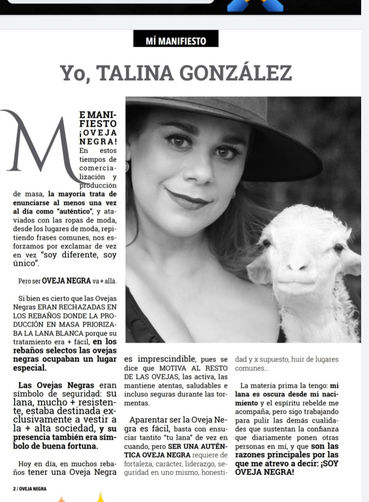 «La materia prima la tengo: mi lana es auténticamente oscura desde mi nacimiento y el espíritu rebelde me acompaña, pero sigo trabajando para pulir las demás cualidades que sustentan la confianza que diariamente ponen otras personas en mí, y que son las razones principales por las que me atrevo a decir: ¡Soy Oveja Negra!» «I have the raw material: my wool is authentically dark from birth and the rebellious spirit accompanies me, but I continue working to polish the other qualities that sustain the trust that other people place in me daily, and that are the main reasons why I dare to say: I am a Black Sheep! » Talina González, periodista.