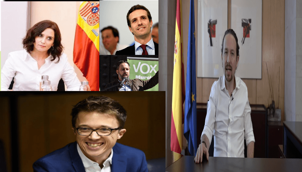 AYUSO LA FALANGISTA EN BRAZOS, CASADO EL PASMADO A LOS PIES DE ABASCAL Y VOX DEMOCRÁCIA Y UNIDAD DEL PSOE Y DE UNIDAS PODEMOS CON MÁS MADRID A PABLO IGLESÍAS, QUE UN BUEN POLÍTICO, JAMÁS PIERDE EL TREN