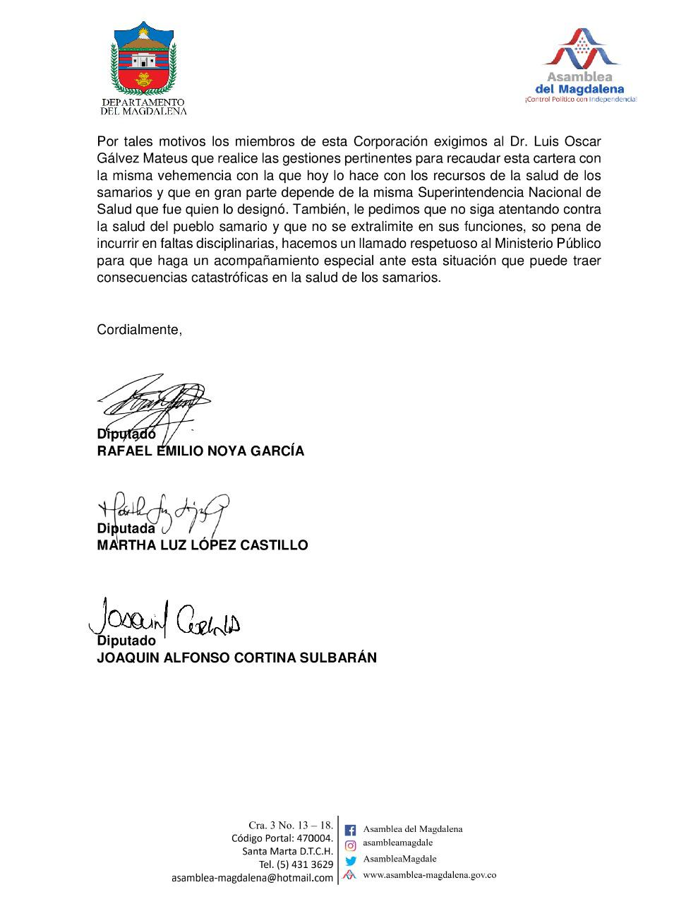 Por tales motivos los miembros de esta Corporación exigimos al Dr. Luis Oscar Gálvez Mateus que realice las gestiones pertinentes para recaudar esta cartera con la misma vehemencia con la que hoy lo hace con los recursos de la salud de los samarios y que en gran parte depende de la misma Superintendencia Nacional de Salud que fue quien lo designó. También, le pedimos que no siga atentando contra la salud del pueblo samario y que no se extralimite en sus funciones.
