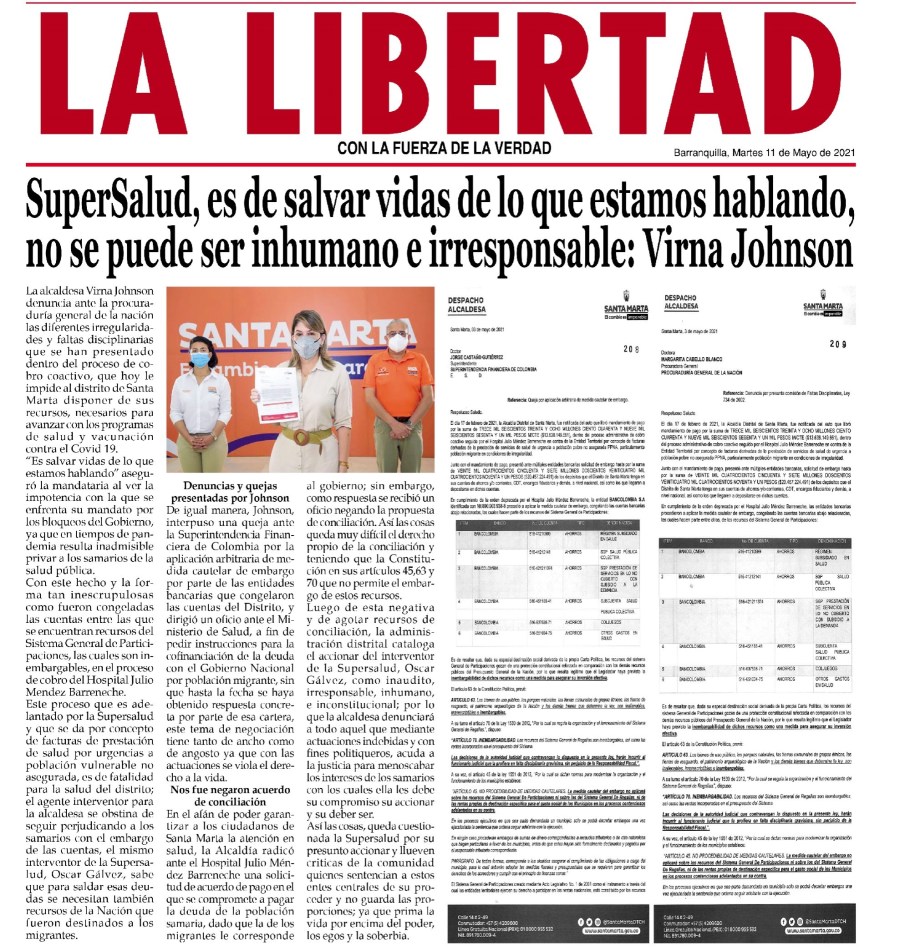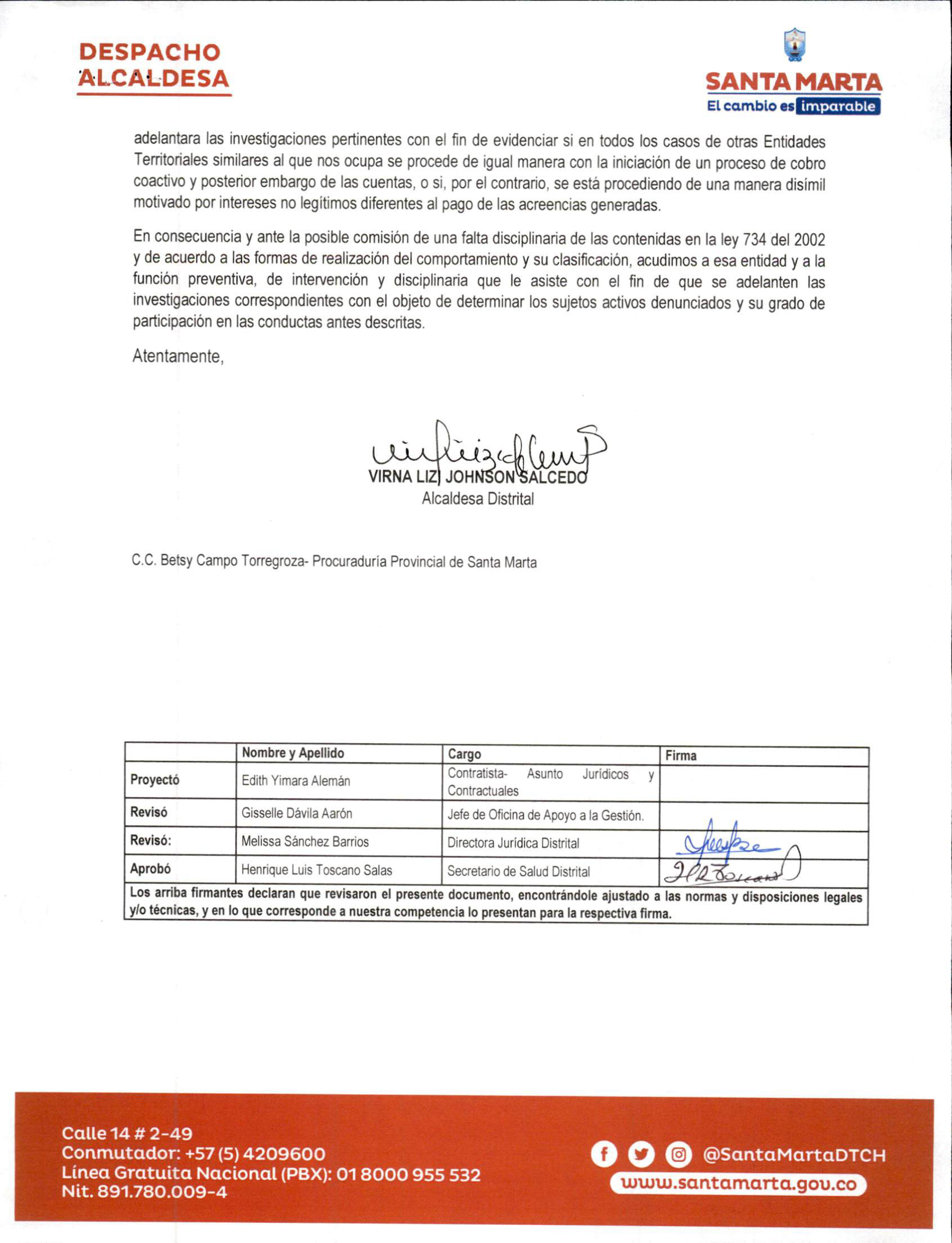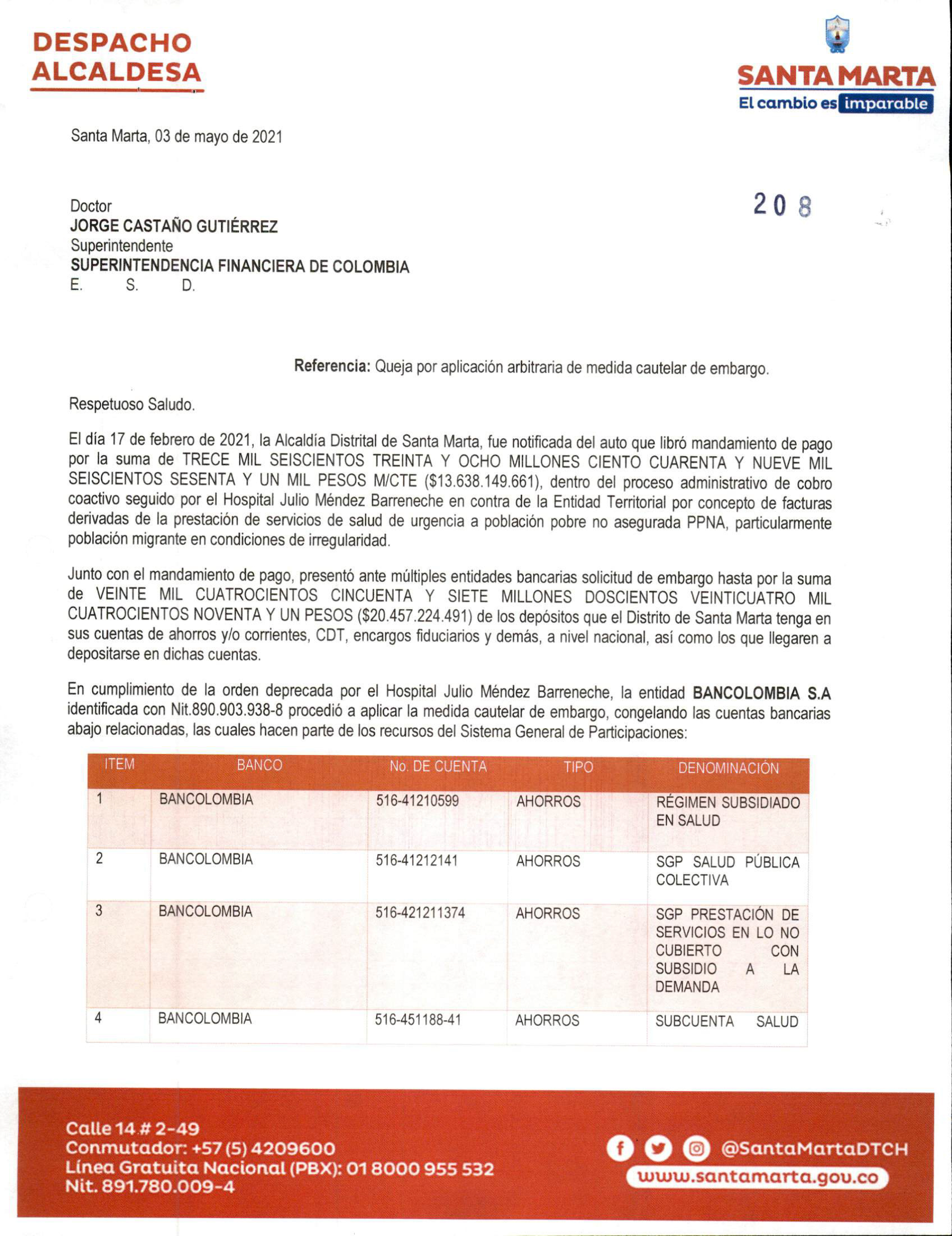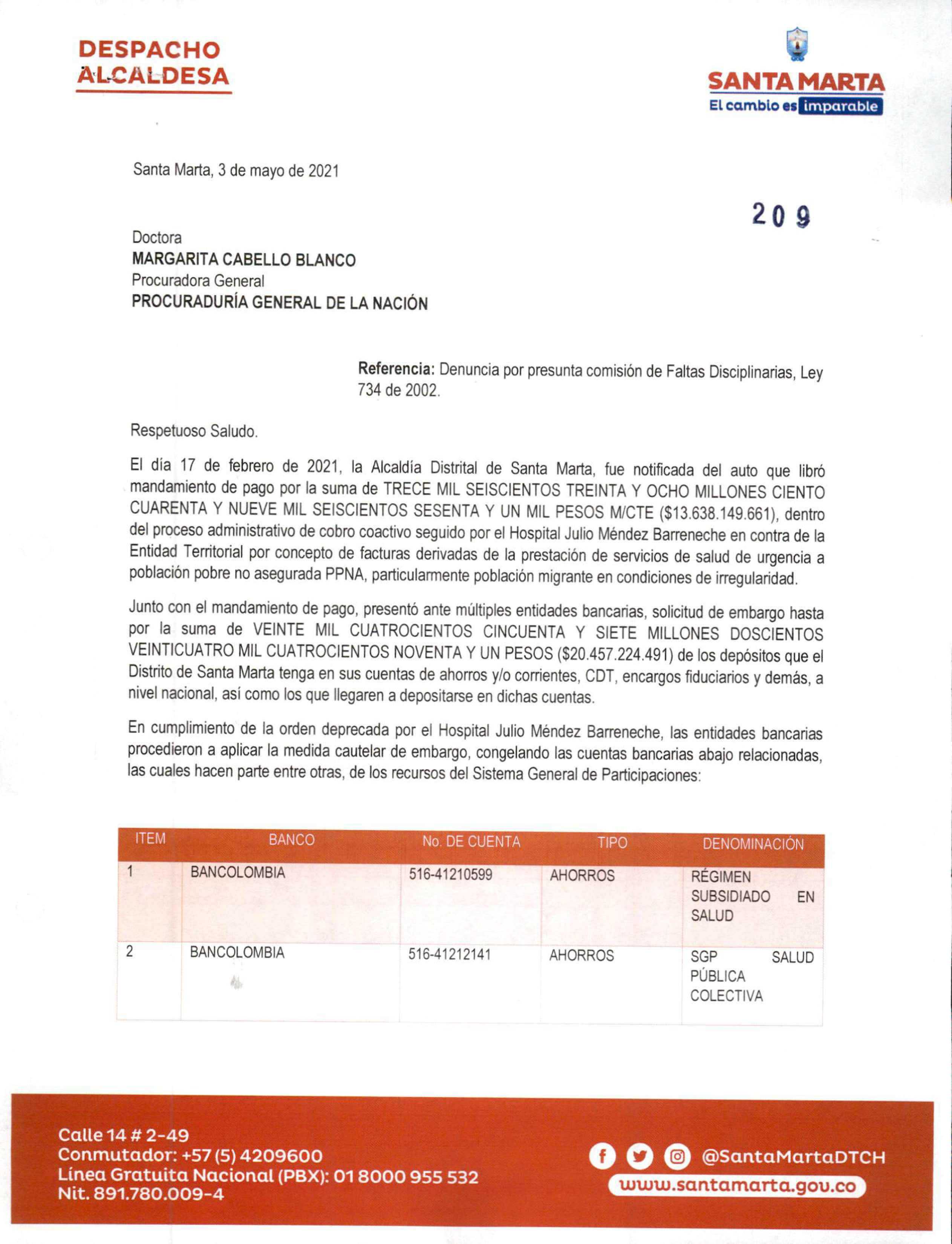 Cabe recordar que según el informe presentado por el mismo Agente Especial Interventor a la Asamblea Departamental del Magdalena el pasado mes de abril quedó evidenciado que el 40% de la cartera, la cual asciende a casi 38 mil millones de pesos, lo adeudan E.P.S que se encuentran actualmente en intervención y bajo el manejo de la Supersalud, no se entiende entonces como el Gerente encargado no ha sido diligente en rescatar estos recursos para cubrir los pasivos del HUJMB sino, que ahora pretende a través de la figura del cobro coactivo, que tanto el Departamento como el Distrito de Santa Marta, respondan por el pago de la atención a las personas que no están afiliadas al SGSSS, la cual en su mayoría es población fronteriza y que tal como lo ha señalo la Alcaldesa de Santa Marta, depende del subsidio del Gobierno Nacional.
