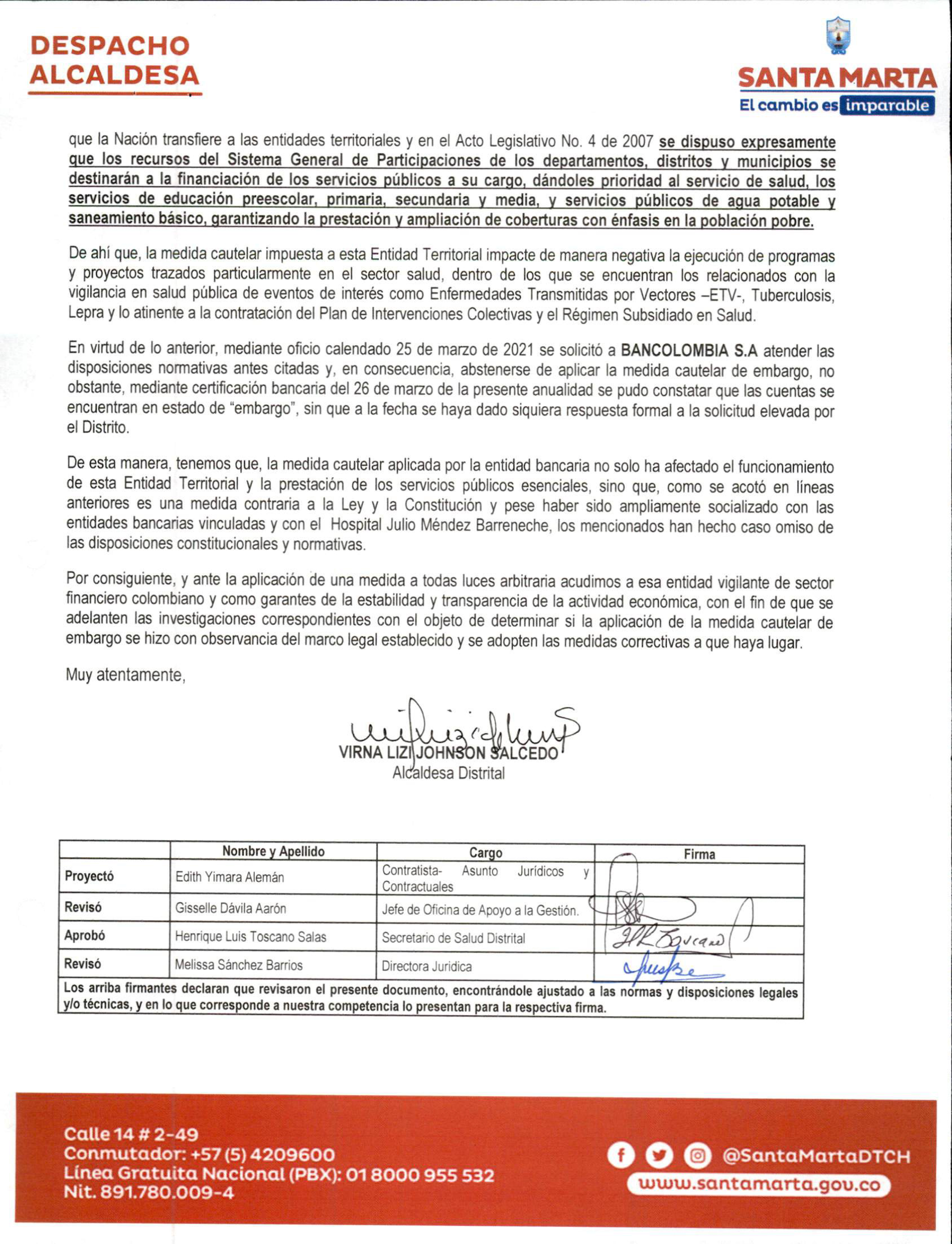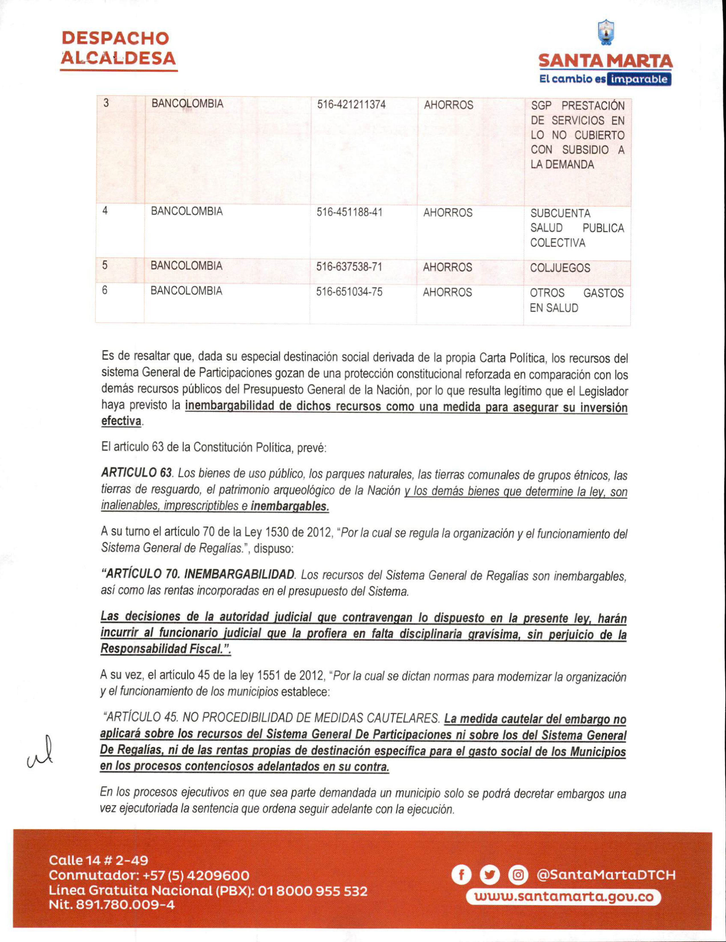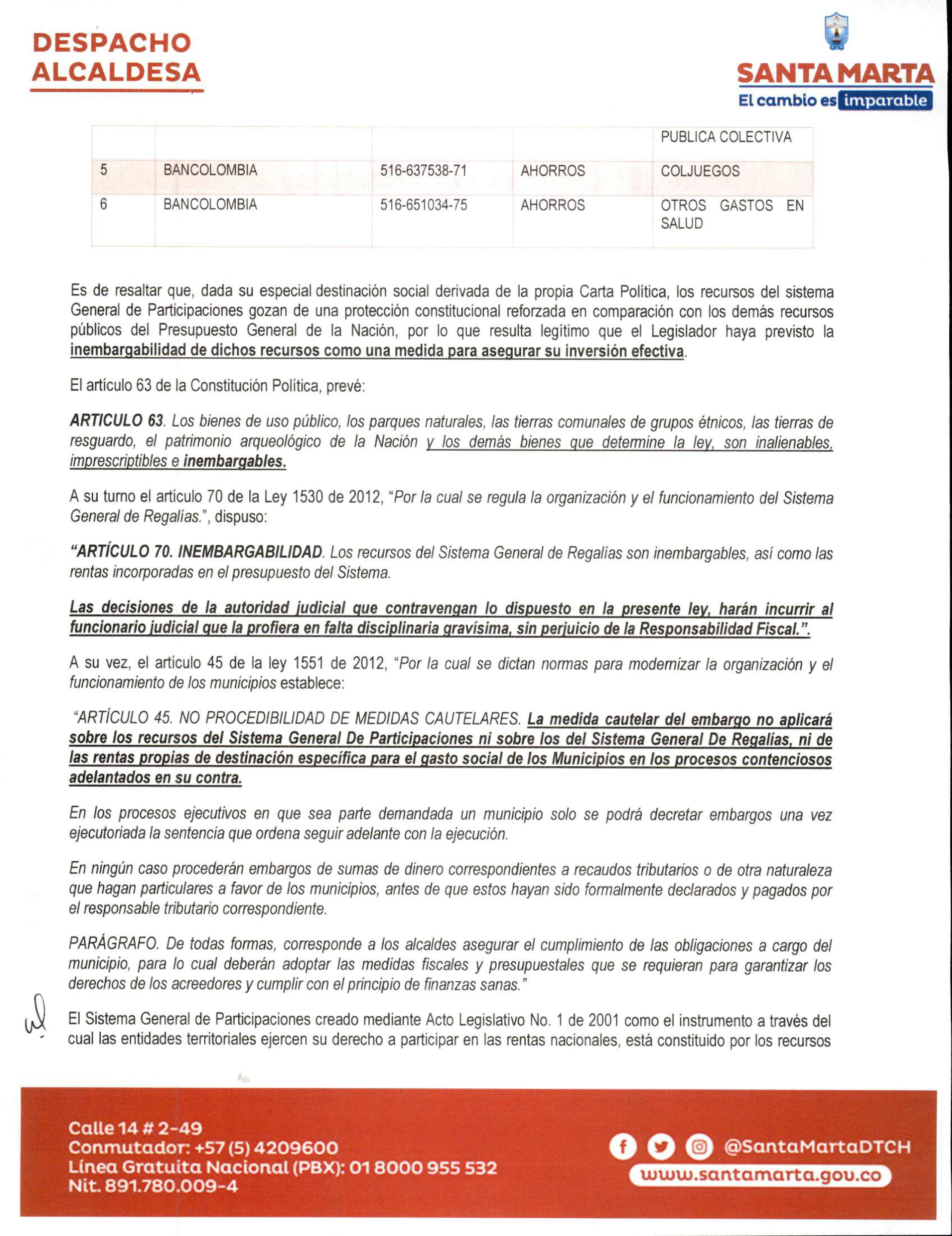 Los Honorables Diputados aquí firmantes rechazamos rotundamente la arbitraria decisión del Agente Especial Interventor del Hospital Universitario Julio Méndez Barreneche, Dr. Luis Oscar Gálvez Mateus, de embargar los recursos provenientes del Sistema General de Participación del Distrito de Santa Marta, atentando flagrantemente contra la salud de los samarios en medio la difícil situación que estamos atravesando por la pandemia ocasionada por el Coronavirus COVID-19. Decisión que a todas luces va en contra de la ley y de la Constitución Política de Colombia, debido a que estos recursos financian la salud y poseen las siguientes características: i) son públicos ii) son inembargables iii) tienen destinación específica y por ende iv) no podrán ser dirigidos a fines diferentes a los previstos constitucional y legalmente, lo anterior señalado en el art. 25 de la Ley Estatutaria 1751 de 2015 por medio de la cual se regula el derecho fundamental a la salud.