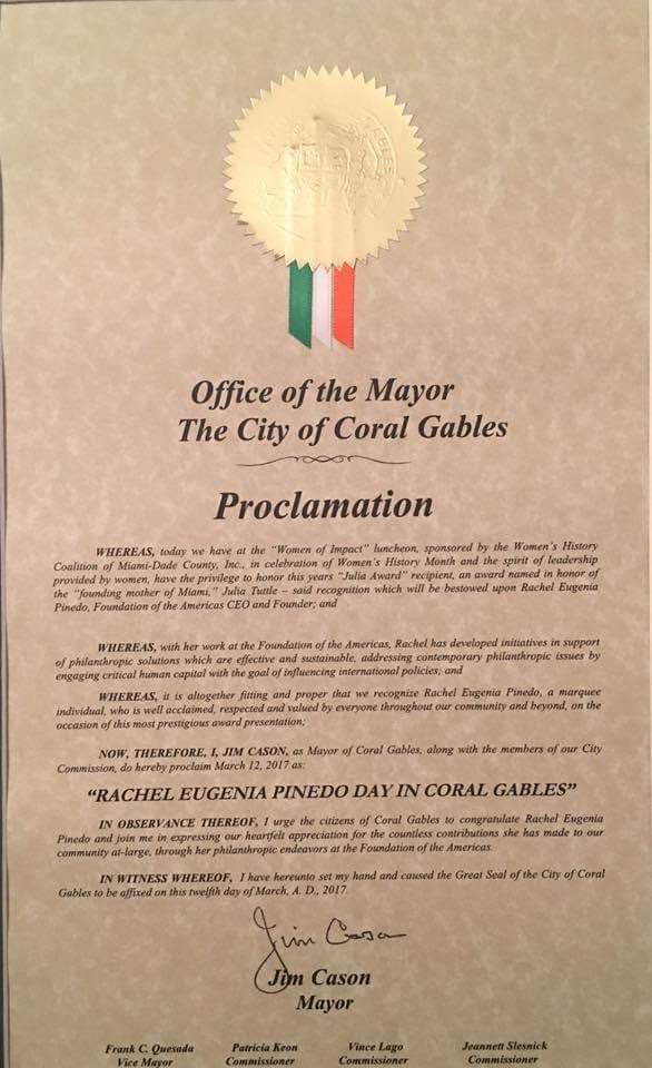 – Proclama de Honor – Ciudad de Coral Gables, Miami, Florida, La Ciudad declara en “Perpetuidad” el 12 de Marzo de cada año como el “Dia de Rachel Eugenia Pinedo / Foundation of the Americas” en esta Ciudad. Proclamation of Honor – City of Coral Gables, Miami, Florida, The City declares in “Perpetuity” March 12 of each year as the “Rachel Eugenia Pinedo / Foundation of the Americas Day” in this City. Proclamation of Honor – City of Coral Gables, Miami, Florida, The City declares in “Perpetuity” March 12 of each year as the “Rachel Eugenia Pinedo / Foundation of the Americas Day” in this City. Proclamation of Honor – City of Coral Gables, Miami, Florida, The City declares in “Perpetuity” March 12 of each year as the “Rachel Eugenia Pinedo / Foundation of the Americas Day” in this City.