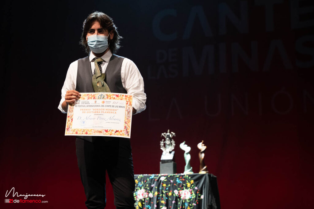 El único finalista de guitarra Álvaro Pérez Álvarez, de Granada, debió tener el corazón en un puño hasta que en la noche de la final se alzó con el ansiado Bordón Minero. Su único y tremendo competidor era la posibilidad de que el premio quedara desierto, algo habitual en este concurso en la categoría de guitarra. Pero afortunadamente y gracias a su limpia ejecución por taranta y alegrías se lo llevó, muy merecidamente. “Desde pequeño mi padre me traía al Festival a ver a los artistas, ver el cante y escuchar la guitarra y tenerlo ahora en las manos después de verlo tantas veces es un sueño”, -dijo emocionado. Álvaro Pérez Álvarez fue ganador en 2017 del primer premio en el Concurso de Guitarra Flamenca de Sevilla y del premio por martinete en el Concurso Nacional de Córdoba 2019.