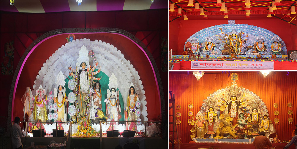 Los pandales se construyen con enormes palos de bambú atados y luego cubiertos con tela. En un extremo del pandal está el escenario donde se coloca a la diosa Durga junto con los otros ídolos mientras que el resto del espacio lo llenan sus devotos. (En tiempos pasados, las familias adineradas solían celebrar el culto en sus palacios o casas grandes). El patio central fue limpiado y decorado para colocar el ídolo de Durga. La gente de todos los alrededores se reunía en la casa para ofrecer sus oraciones a la Diosa. Poco a poco, con el tiempo, los pandales fueron creciendo y ahora se instalan en colonias, parques o incluso en las carreteras durante la época festiva. Visitar un pandal tras otro es una norma ahora. La multitud bellamente vestida se mueve de un pandal (templo temporal) a otro, reuniéndose con amigos y familiares mientras mira a la Diosa colocada en cada uno de ellos.
