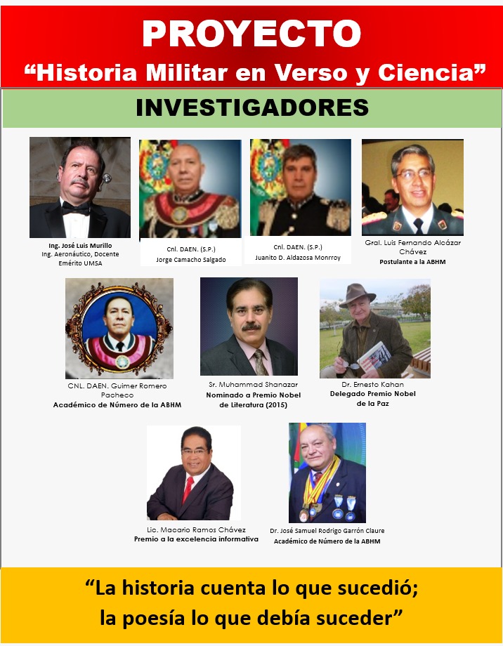 In addition, another purpose of the project is to provide information and emotions to build identity and patriotism in bolivians, because military history is immersed in Bolivian history through its battles, wars and combats that Bolivia and its military faced; the tools to achieve this goal are poetry and research, both are interrelated as awareness, educational and didactic elements. These characteristics make the project a pioneer in the world, Bolivian military history is projected for the first time, uniting the history of the world, gathering its intellectuals, its researchers and selecting its best poets.