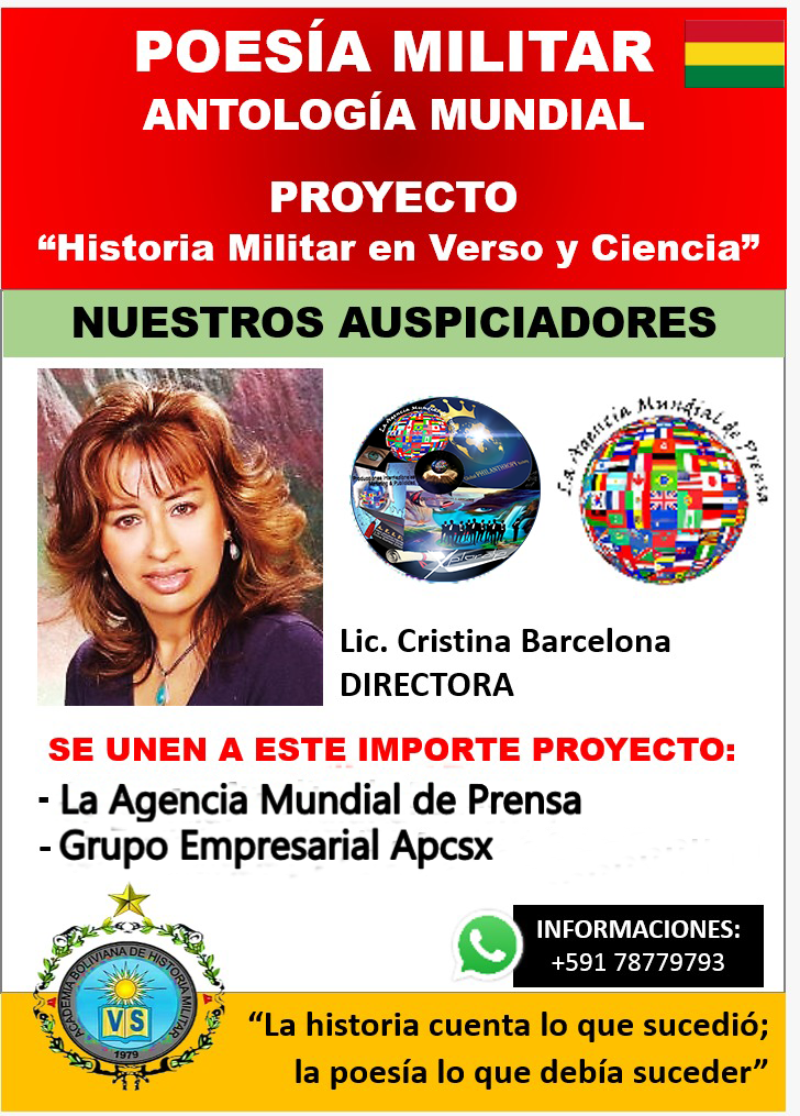 Jackeline Barriga Nava, psychologist writer and poet carried out a worldwide project, pioneer and innovative based on «MILITARY HISTORY IN VERSE AND SCIENCE», the same one that he passionately mentions and that in turn, 54 poets and writers of different nationalities collaborated with him, who left traces for their country Bolivia in said event.