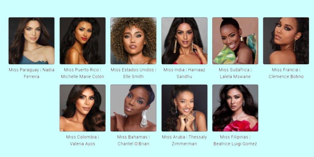 In addition, there were only ten finalists of the 16 previously mentioned; Paraguay Nadia Ferreira, Puerto Rico Michelle Marie Colón Ramírez, United States Elle Smith, India Harnaaz Sandhu, South Africa Lalela Lali Mswane, Bahamas Chantel O’Brian, Philippines Beatrice Luigi Gomez, France Clémence Botino, Colombia Valeria Maria Ayos Bossa, Aruba Thessaly Zimmerman.