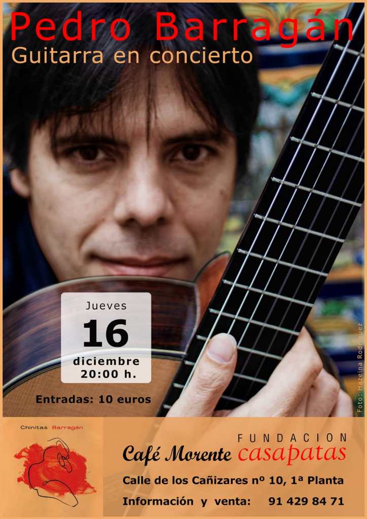 Una invitación personal para la guitarra en concierto de Pedro Barragán, el 16 de diciembre en el Café Morente de la Fundación Casa Patas, presentando su nuevo trabajo discográfico “Chinitas”. Un recorrido por la geografía flamenca con sus composiciones por serranas, alegrías, soleá, guajira, bulería, malagueña, soleares, tango, minera, cantiña, granaína, siguiriya y peteneras.