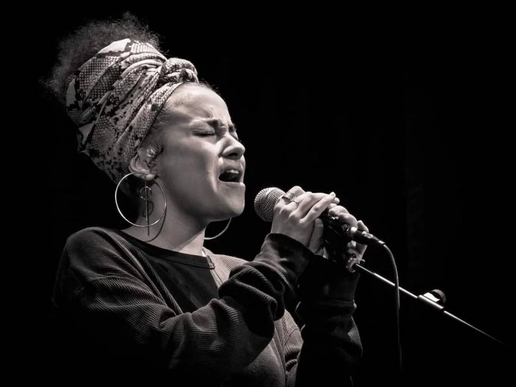 Su voz… no es blanca ni cien por cien negra, es una voz mixta, de una belleza extraordinaria y toda la variedad de registros que puede esperarse de una cantante de jazz y todo lo que le sigue. Realmente impacta, enriquece el concierto, engancha, se alza como protagonista instrumental. Un placer escucharla.