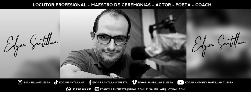 EDGAR SANTILLÁN TUESTA, of Peruvian nationality, medium height, empathetic and very sociable, he is a born declaimer par excellence, an artist of the same. A professional who has been able to give a plus and an important twist to the declamation not only by saying beautiful texts aloud but also by giving a great artistic nuance to his interpretation, showing off that voice that is the product of years of work as a renowned Professional Announcer and who also, thanks to his great expertise as Master of Ceremonies, knows how to put that leading touch, fluency and attitude that of course, reinforced with his acting condition, gives him that touch of distinction.