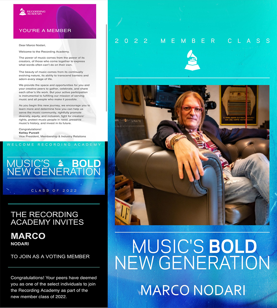 As we well know, Marco has been a member of the Latin Grammy Academy since March 2020 and oh oh, a most pleasant and well-deserved surprise, since July 2022, two years later, it was two in the morning, as he tells us, finds out that he also became part of the Recording Academy Grammy Awards, U.S.A «I received an email from the Recording Academy, but I thought it was an advertising-event, which they always send me, however the surprise was that it was written that I was Named a Member of the Recording Academy Grammy Awards, I started to cry like a child… Really, it was an immense satisfaction and honor, a great achievement… being a member of the two most important Academy in the World, it is the Oscar of Music… and Being a Member is a Privilege and Honor for me».