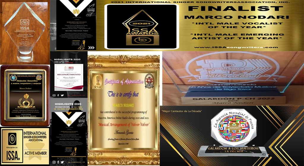 Marco, was nominated for the «Intercontinental Latin American Gold Award 2020 – 2021, the award of World Excellence», in his capacity as Italian Musician, Composer and Producer with the Greatest International Projection and for the «4th Intercontinental Meeting of Culture», in the city of Puerto Cabello state of Carabobo, Venezuela, another Award-Recognition in Miami as SOCIOCULTURAL AMBASSADOR Representative of Italy, in the house of culture of Miami for the Latino communities in the USA, in addition to being declared by public vote as The Singer-Songwriter of the Decade in the Awards from the World Press Agency. In 2021, he had 5 Nominations in ISSA INTERNATIONAL SINGER SONGWRITER ASSOCIATION (USA) Winning in August the First GOLD Award, Best International Emerging Artist of the Year among many others….