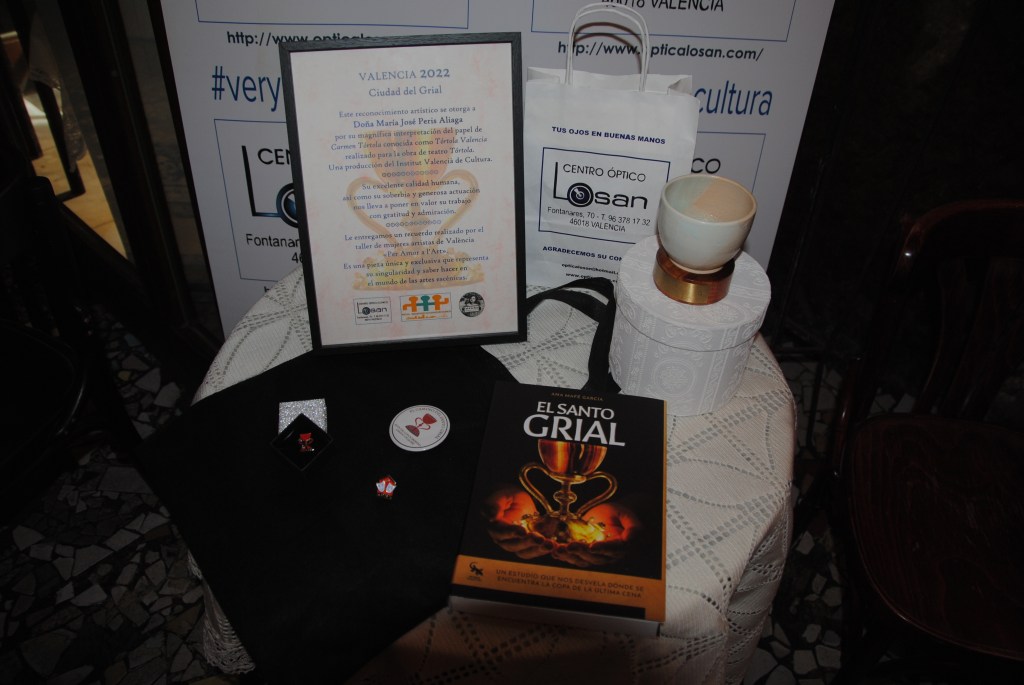 Junto al diploma honorífico que daba fé de la distinción, entre otras cosas, una réplica del Santo Grial en color blanco realizado en el taller de cerámica creativa » Per Amor a l´Art» y un ejemplar del l ibro » El Santo Grial». Pero sin duda, lo que más sorprendió por su originalidad, fueron unas prácticas y modernas gafas de buceo adaptadas a la graduación de la homenajeada.