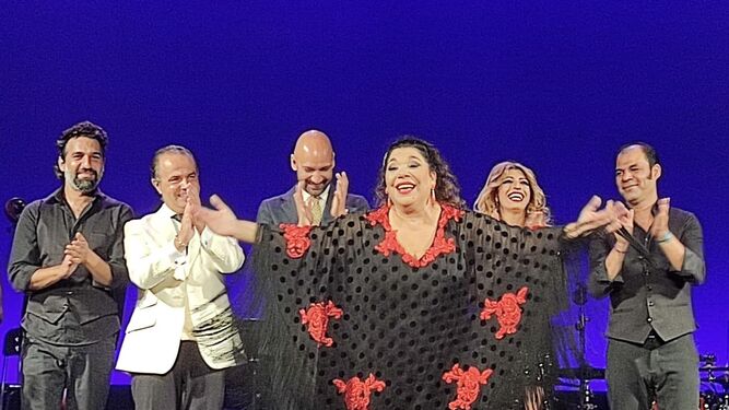Rodeada de tres pianistas, Elena López, Rosario Montoya la Reina Gitana, y José Zarzana; de la guitarra de Manuel Valencia y las palmas de Chicharito de Jerez, Manuel Macano y Javi Peña; de la violinista Irene Ortega, del contrabajo y chelo de María Lomas de Goñi, la percusión de Perico Navarro y del cantante lírico Fernando Soto. Todos de Jerez y de Jerez casi todo el equipo técnico y la guinda sobre el exquisito pastel, en la comunicación el periodista Joaquín López Bustamante,pareja de La Macanita. Faltaba un homenaje, a la cantera gitana de artistas nacidos en Jerez, que abarcan todos los instrumentos y géneros musicales. A los que están en este evento y a muchos más que están sin estar. Y otro homenaje más: Al barrio de Santiago.