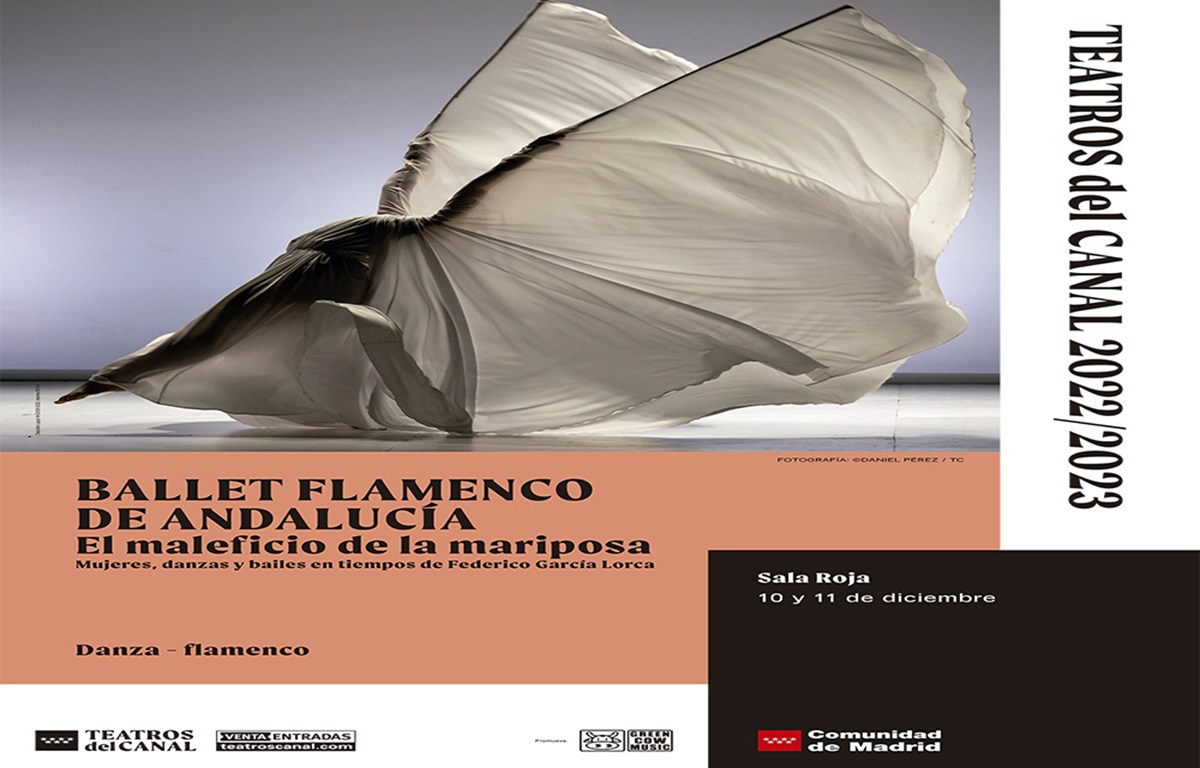 ‘El maleficio de la mariposa’ interpretado por el Ballet Flamenco de Andalucía (BFA), de la Consejería de Turismo, Cultura y Deporte, de la mano de Green Cow Music, y dirigido por Úrsula López, se podrá disfrutar hoy día 10 de diciembre a las 20:30 horas, y mañana domingo 11, a las 19:00 horas, en los Teatros del Canal de Madrid.