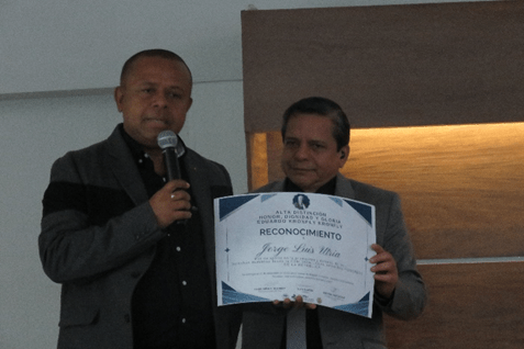 The posthumous tribute to Mr. Eduardo Kronfly Kronfly was received by his surviving spouse, Mrs. Flor David de Kronfly and the illustrious jurist, Director of the Faculty of Law of the San Martín University, Carlos Eduardo Kronfly David, who was also distinguished