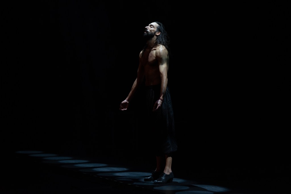 Bailar no es solo bailar, ¡qué cierto! Eduardo que en otras ocasiones se ha movido en espacios alternativos, aquí, con la inestimable ayuda de una iluminación que roza la magia, se crean esos espacios alternativos, y ya podemos ver al fondo un retablo que se extiende sin fin, o un bosque tan onírico como real, o esas escenas que nos recuerdan la pasión de Cristo. Qué poquitos elementos físicos, tangibles, son necesarios para completar todo lo que la luz o las sombras pueden hacer real. El diseño de iluminación de Fernando Martín es de un protagonismo absoluto, justifica plenamente el “es más que bailar”, es crear los espacios para bailar y teatralizar lo que cuenta el baile, el cante, las guitarras.