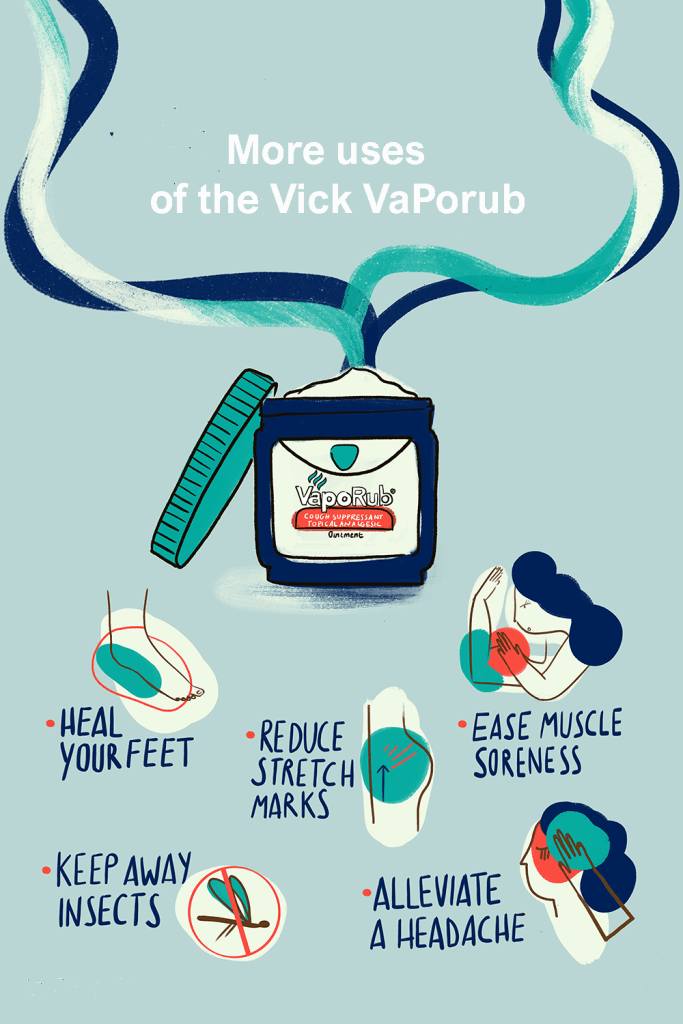 Thanks to the menthol and oils that vaporub contains, it is said to be effective in concealing and eliminating stretch marks on the skin, softening bright colors until little by little they are completely blurred, with patience.