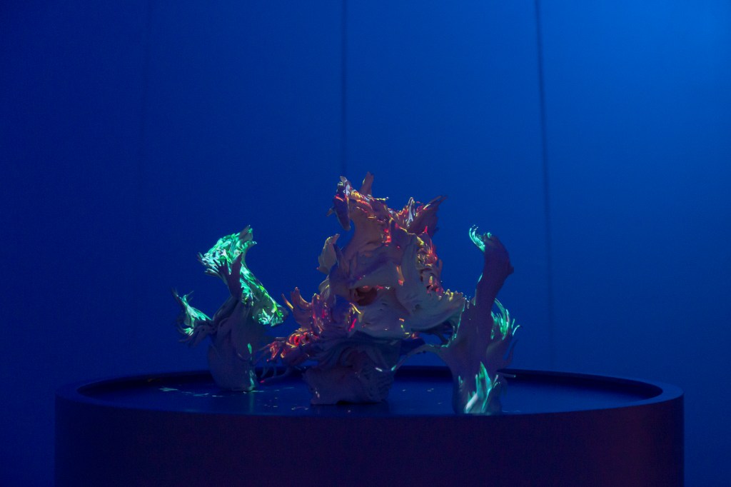 Brendan Dawes, Passengers Bcn. Impresionantes esculturas metamórficas impresas en 3D, que cambian de color e identidad desde sus diversos ángulos de visión. Representación, según el artista, del tráfico de pasajeros en el aeropuerto de Barcelona entre 2019 y 2021, antes y durante la pandemia, pero cada espectador puede tener su propio sistema de identificación. Es una interacción entre lo digital y lo físico.