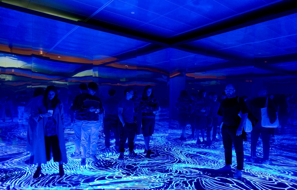 Ahora estamos ante Machine Memoirs del gran artista multimedia Refik Anadol. Podéis ver que es una especie de ciudad futurista, extraña, experiencial, cambiante. Esto es IA con su serie de parámetros gestionados con su equipo de veinticinco personas. Esta obra de arte inmersiva está inspirada en colaboraciones con la NASA y refleja los intentos de la humanidad por explorar las profundidades del espacio. Van sucediéndose desiertos, objetos abstractos que sugerirán algo diferente a cada espectador, mosaicos irregulares en relieve con diversos matices de rojo, azul y verde, y más escenarios que representan millones de fotografías del espacio, pero que son algoritmos, no fotografías. Su interacción es un juego.