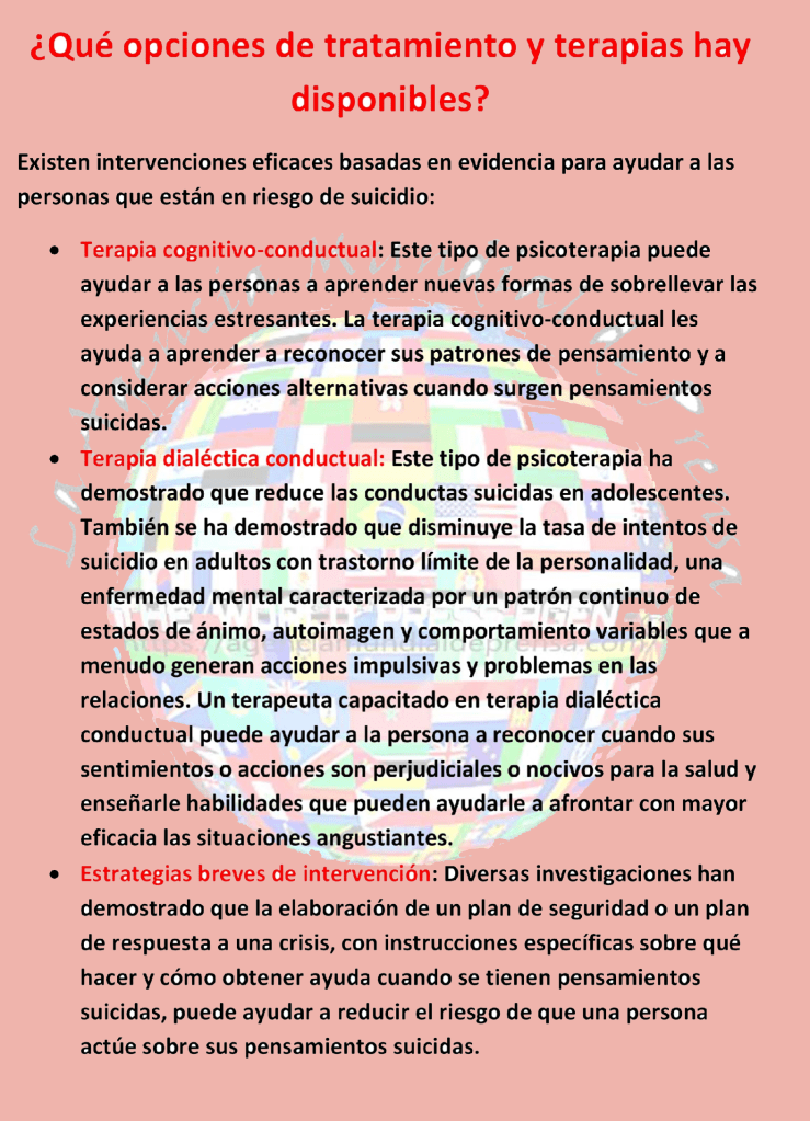 Como se puede apreciar, la relación entre trastornos de salud mental y más concretamente, la depresión, con la conducta suicida es un asunto de suma importancia que debe ser atendido de forma inmediata. Por tanto se tiene que tomar atención a lo siguiente…