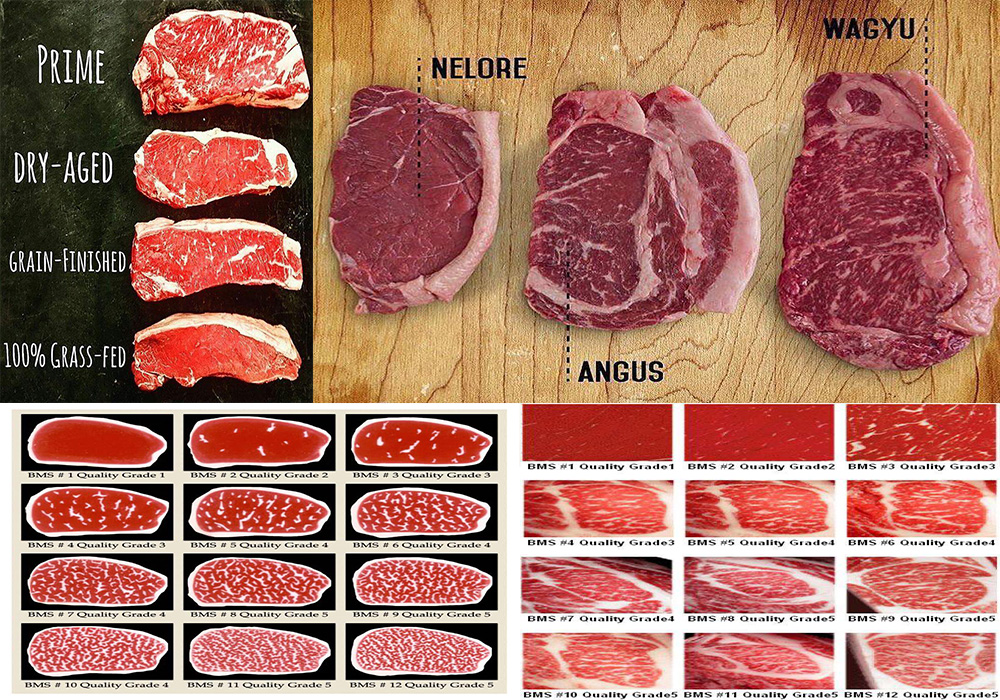 Del mismo modo, ciertos cortes cuentan con más marmoleo que otros. La costilla, la entraña y el lomo son de las piezas más marmoleadas, mientras que el cuadril o el solomillo tienden a tener menos grasa. Es por eso, que los inspectores observan el músculo del lomo, entre la costilla 12 y 13 para determinar el grado de marmoleo del animal.