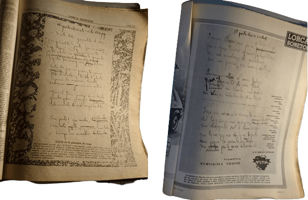 Dos sonetos, fotografiados con permiso de la familia García Lorca de los originales autógrafos de Federico: El poeta dice la verdad y Soneto de la guirnalda de rosas. Pedimos permiso a la redacción del diario ABC para ilustrar nuestra crónica con fotografías de sus fotografías. Rezamos por una repuesta positiva.